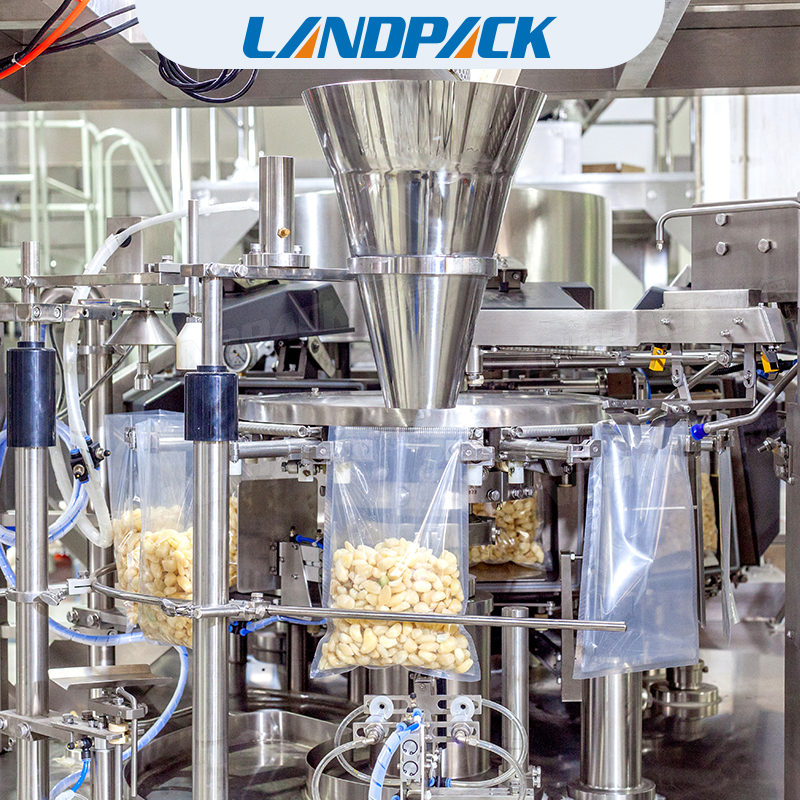 給袋式真空包裝機(jī)代替了手工包裝,操作人員只要將做好的一個(gè)一個(gè)的袋子,一次性將幾百個(gè)袋子放在設(shè)備的取袋部,設(shè)備機(jī)械手會(huì)自動(dòng)的取袋、打印日期、開(kāi)袋、給計(jì)量裝置信號(hào)計(jì)量并落料、封口、輸出。